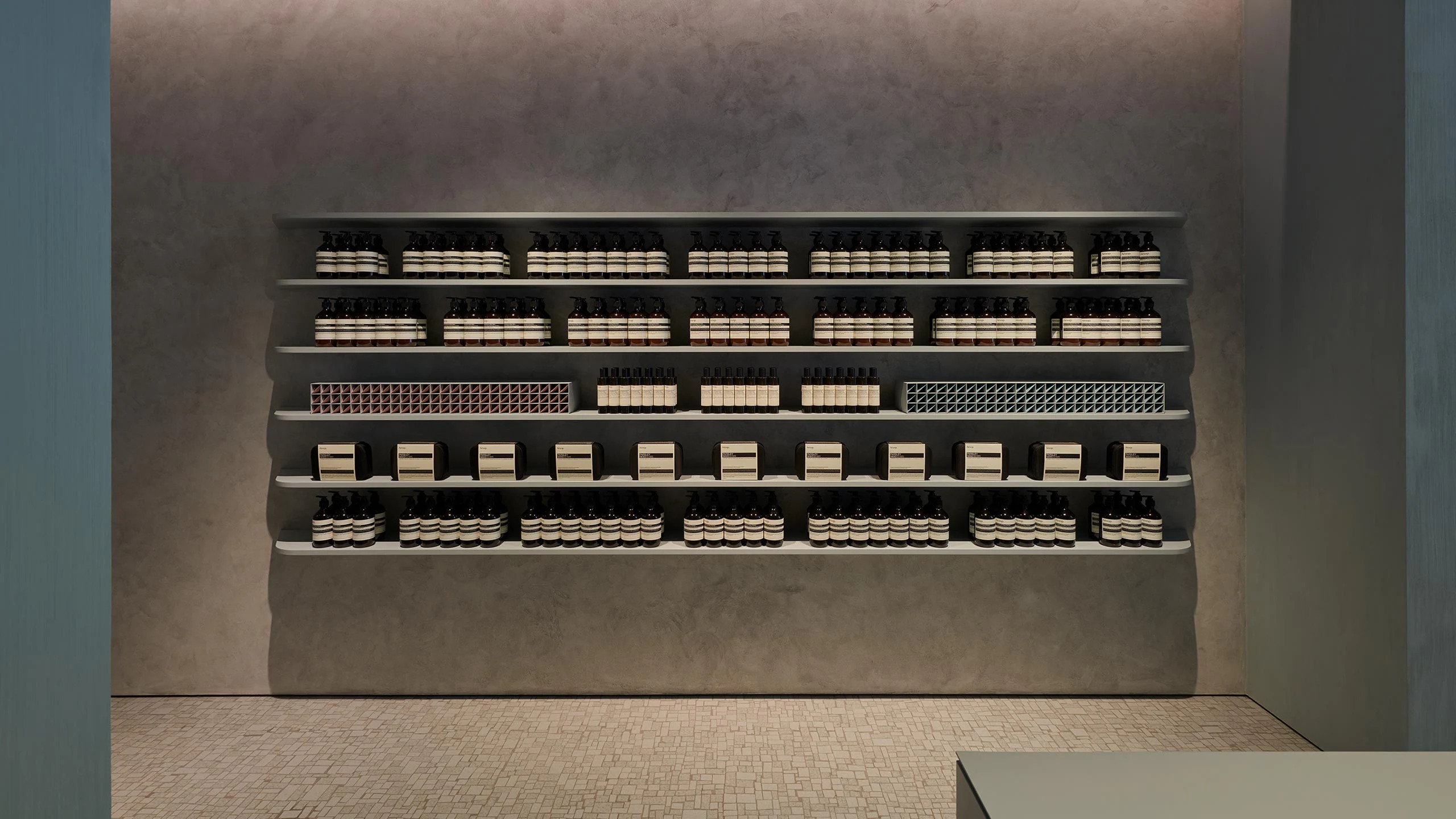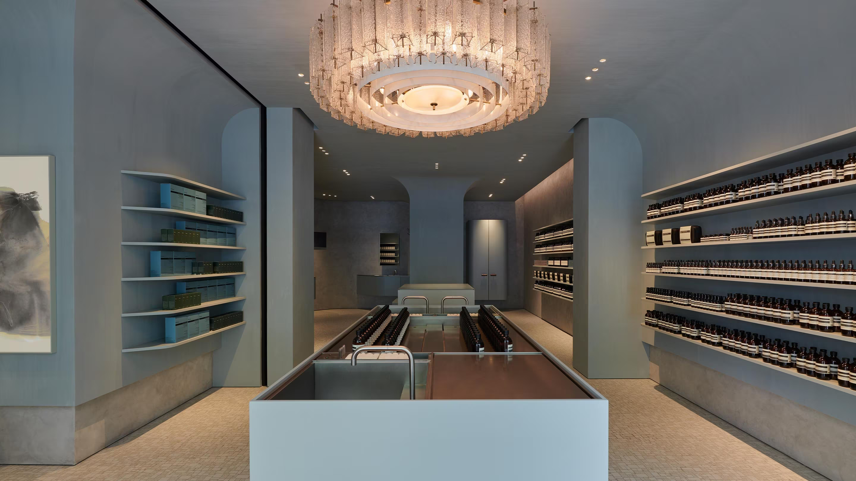 The pale blue of the mosaic washes over the vaulted ceiling, whose boundaries with the walls are blurred by fluid lines, creating alcoves that offer respite and privacy. A monumental basin occupies the centre of the room, echoing the arched geometry and providing ample opportunity for customers to gather and connect while discovering our full range of formulations for the skin, hair, body and home.