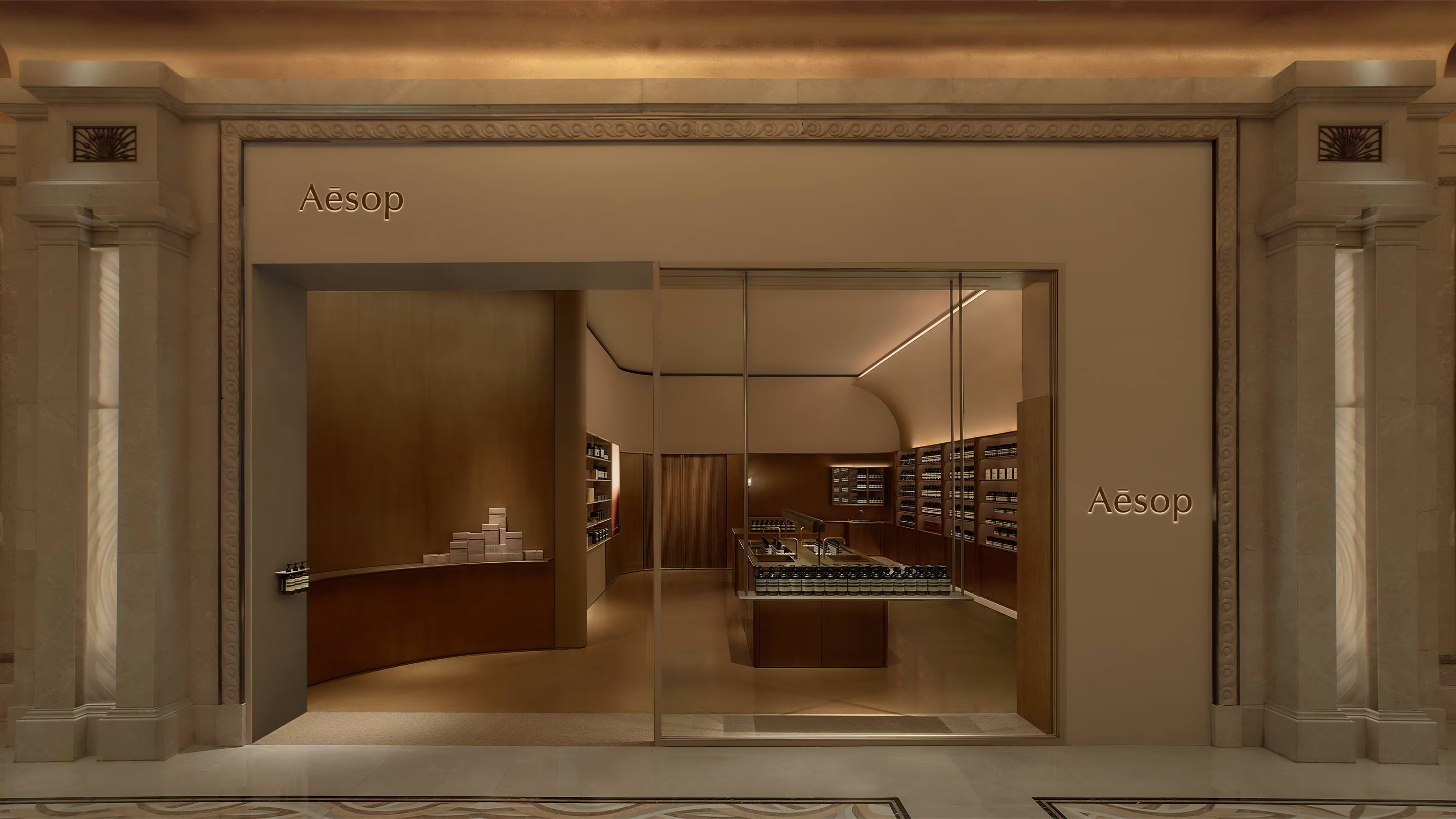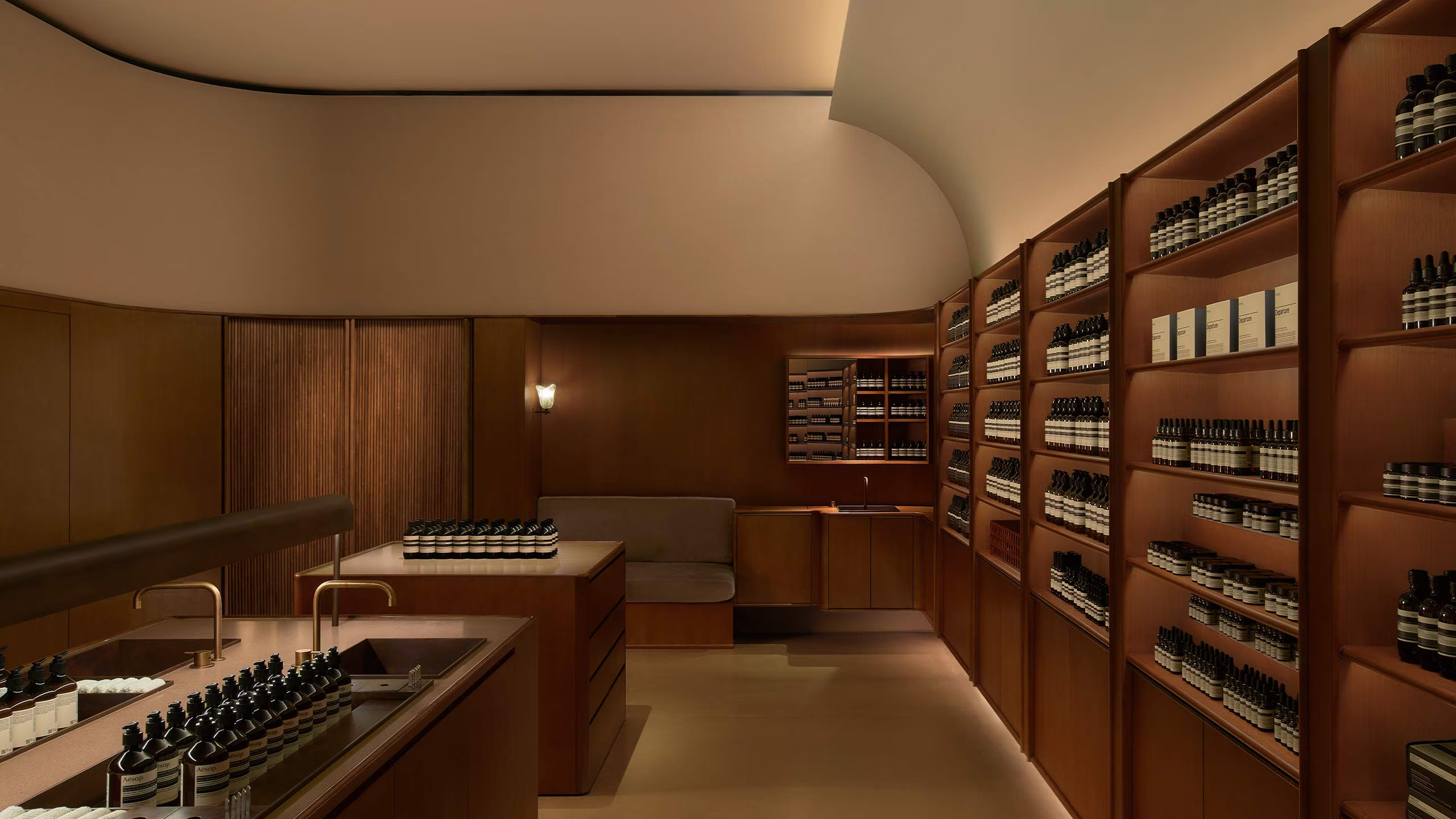 Our space is laden with nostalgia for small businesses of this ilk, taking material and formal cues from their once-ubiquitous wooden rice barrels. The compact room is sheathed in walnut timber cabinetry and acoustic felt in an earthy hue, with rounded corners and curves that extend up to the ceiling. A quartet of bronze basins occupies the centre, inviting visitors to explore our formulations with gently running water. At hand on the countertops and underfoot, a refined pebble terrazzo evokes scattered grains of rice.