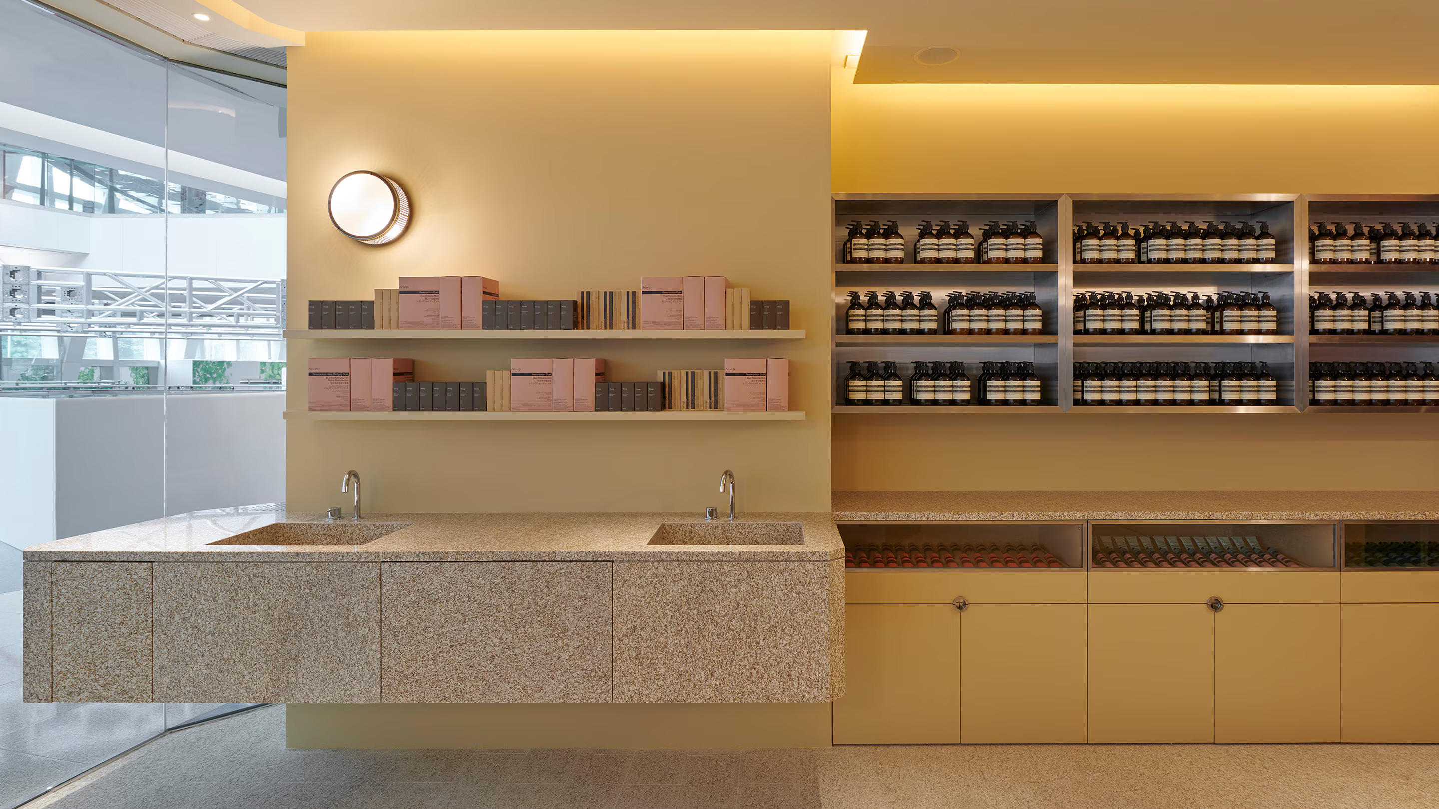 靈感源自於九龍塘周遭的街景,Aesop 品牌內部設計團隊精心打造隱身於又一城購物商場中的 Aesop 店舖空間。九龍曾經是一座充滿圍牆的城寨,現在隨處可見低樓層、高密度的建築物依偎在一起,營造出獨特的鄰里感。透過這座城市的建築語言,我們可以窺見家庭生活、折衷主義與實用主義的痕跡。