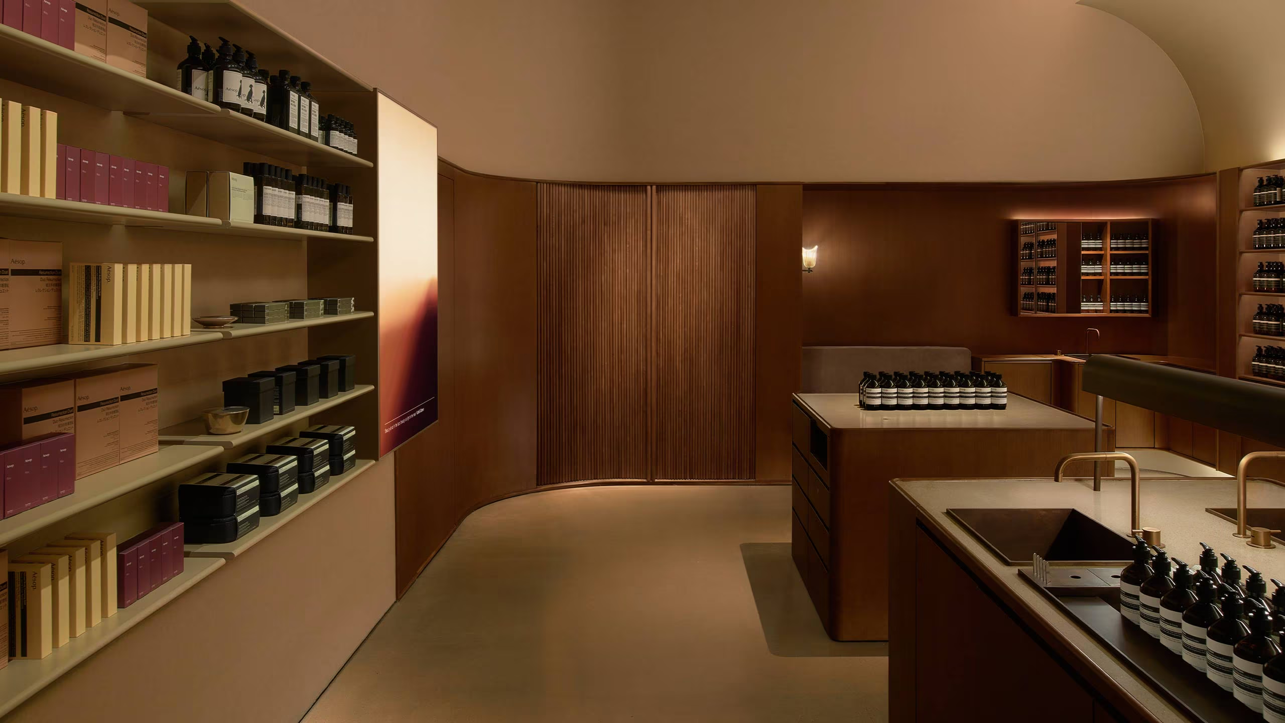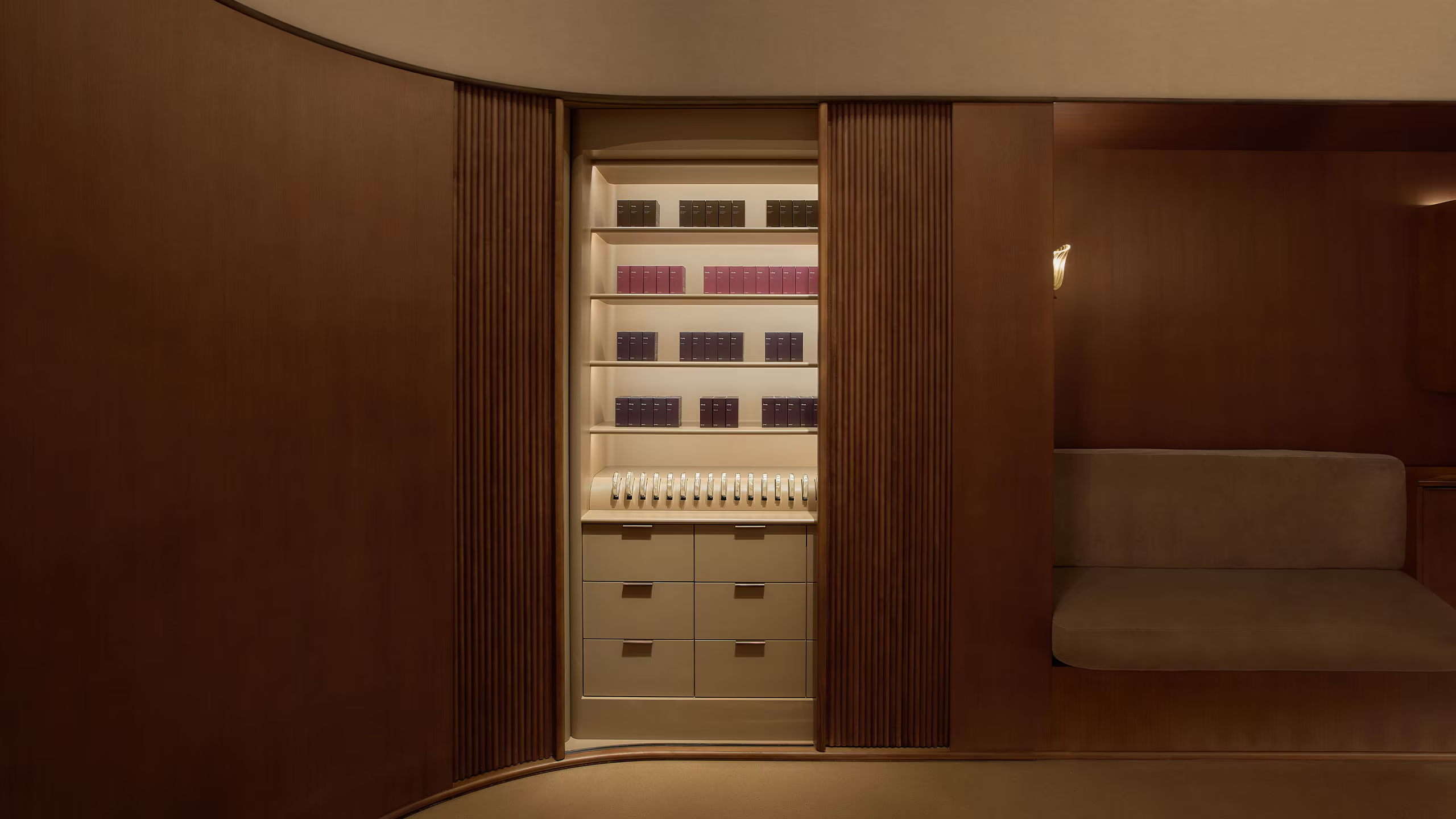 我們精心打造的店舖,以細膩入微的設計語彙,寫下對這些小型商舖的懷舊情感;團隊巧妙地借鏡昔日常見的木製米桶,將其材料及形式的元素線索,編織入空間敘事裡。店內採用具溫暖質感的胡桃木層櫃,搭配上大地色調的聲學氈布物料,勾勒出優美流暢的曲線感,從牆面及角落延伸至天花板,如同一曲悠揚的旋律,輕輕迴盪。空間中央設有四座青銅水槽,水流涓涓,彷彿以低聲細語,溫柔邀請訪客來探索我們與眾不同的配方系列。手掌指尖觸碰的桌面,以及腳下踏著的地板,均以細緻的水磨石呈現,宛若散落的米粒,步履間都能感受到歷史的紋理觸感。