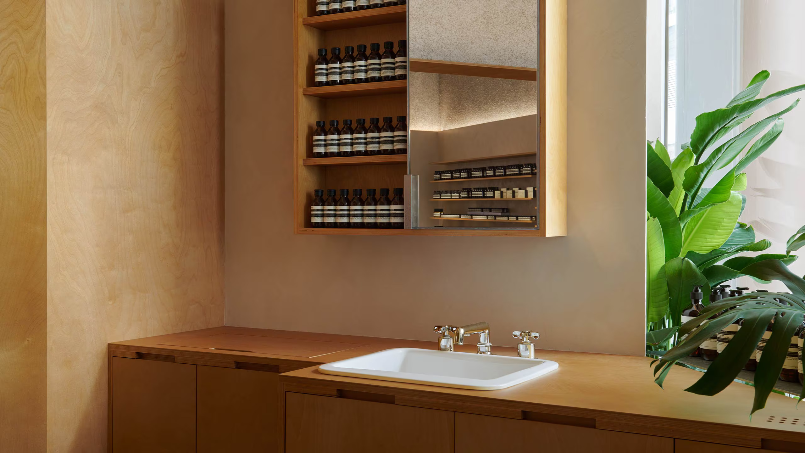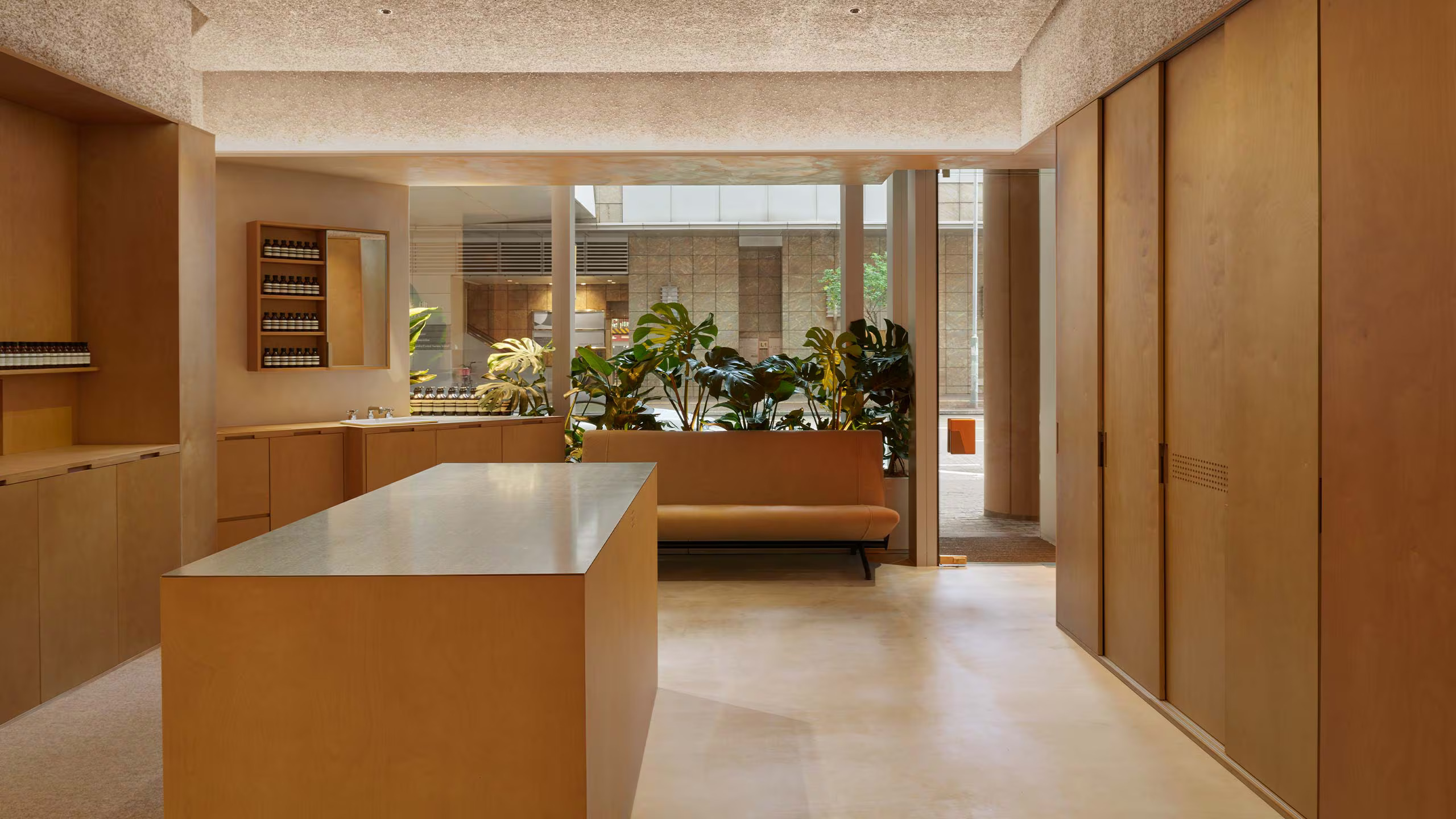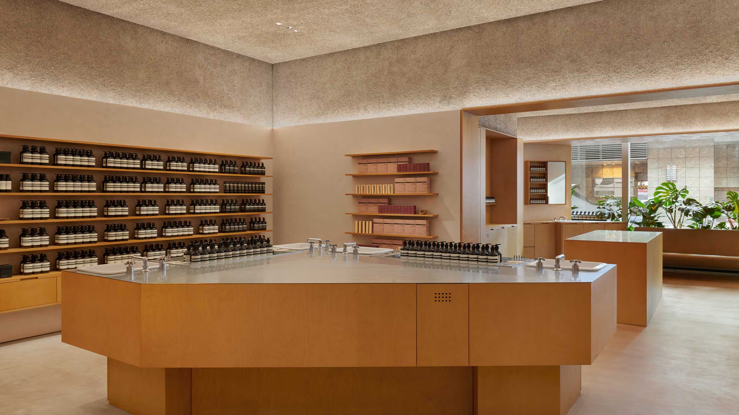 店舖外牆身以錯落有致的夾板拼接而成,旨在激發好奇心,向行人遞出溫暖邀約。踏入店內,空間分為兩個區域。首先映入眼簾的是四台陶瓷水槽,無縫地嵌入於木結構中。在輕柔的潺潺水流下,顧客能在此親身體驗 Aesop 肌膚、秀髮及身體護理配方,通過進行起泡、清潔等動作,深入認識 Aesop 深思熟慮的護理哲學。第二個區域則營造出如同家一樣的溫馨感受,斜角天花板賦予空間親密而愜意的氛圍。這裡也設有獨立水槽區,提供更具私隱度的諮詢空間,Aesop 專業顧問會在此依據每位顧客的個人需求,提供個人化的產品建議。除外,柔軟舒適的沙發提供了沉思與休憩的機會;而專屬的香水區域,則邀請客人展開一場沉浸式的嗅覺之旅。青翠茂盛的植物柔和地連接內、外空間,為整體增添了層次與立體感,創造出一片靜謐而溫暖的美好景致。