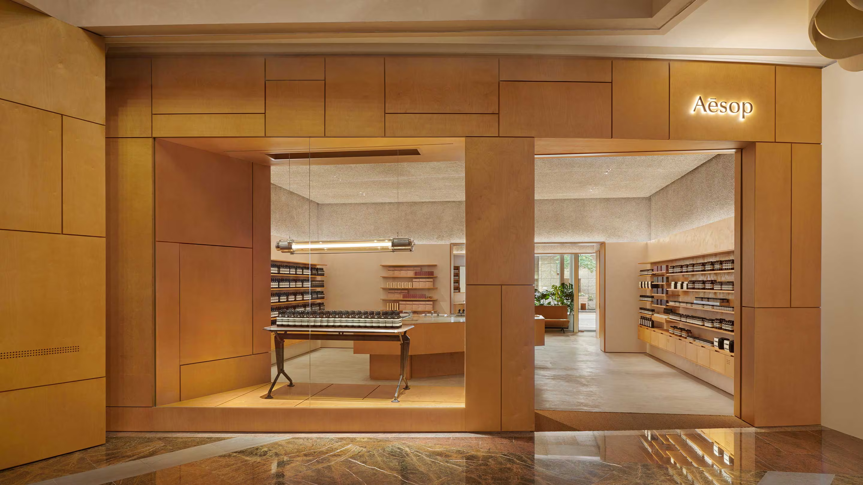 在香港熙來攘往的旺角,Aesop 朗豪坊宛如一處安謐的感官庇護所,讓人徜徉於和諧靜心的氛圍之中。這個空間由品牌的內部設計團隊精心打造,「木夾板」因其溫潤質感、多變形態和低碳排放的特色,而被選作主角。在建築世界中,夾板經常被視為平凡無奇的材料,但在此以大膽方式重新演繹,層層交疊出具雕塑美感的詩意構圖。設計團隊與本地工匠攜手合作,將原本將會被丟棄的廢料木屑,應用在牆壁與天花板上,不僅創造出迷人溫暖的觸感紋理,更提供了撫慰人心的隔音效果 ,舒緩都市人疲憊的耳朵。在這片柔和優雅的空間中,人們可以暫時遠離城市喧囂,在美好的環境中盡情探索擺放於特製雪櫃中的 Aesop 產品系列,享受一場提振精神的感官體驗。