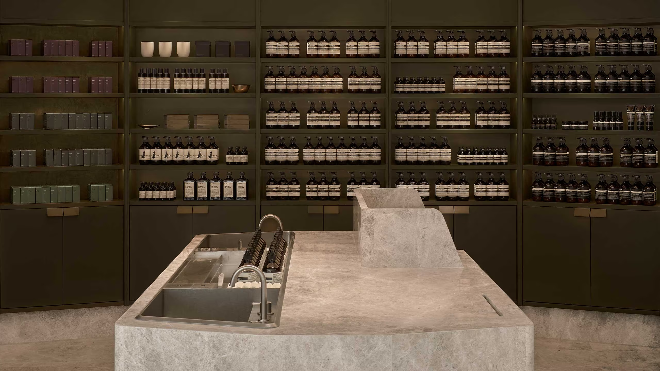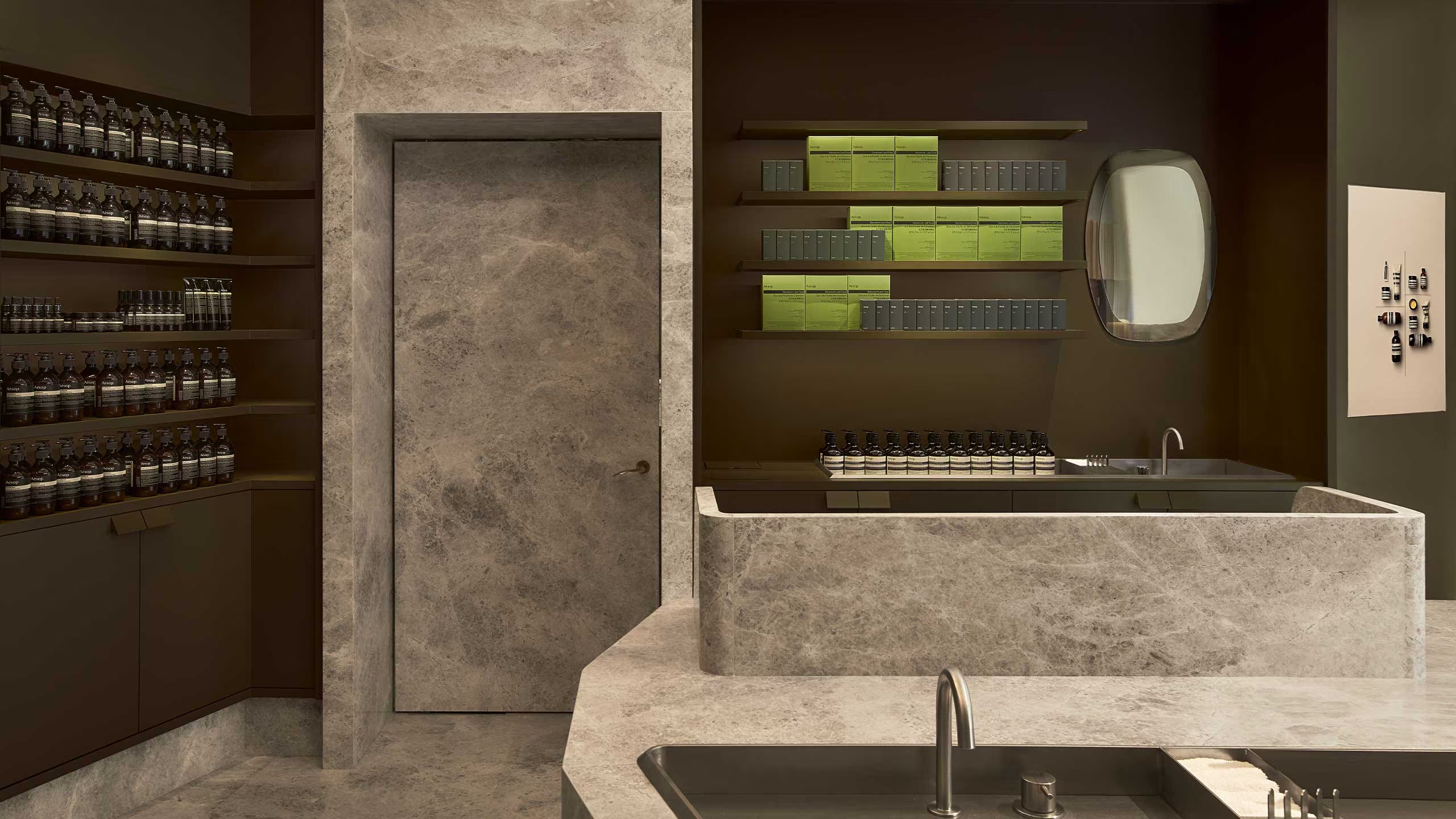 在店舖中央,佇立著一座引人注目的巨型水槽——客人可以在此盡情探索一系列獻給肌膚、秀髮、身體、家居的產品配方。為了向葡萄牙建築風格的華麗細節致敬,設計團隊運用了同一塊石材,從中央向外圍鋪滿整片地板、直到牆邊,然後繼續沿著牆壁向上延伸,再延展至店舖後方。暖灰色調的石材來自中國雲浮,與澳門街道上常見的天然建材相互呼應。一眼望去,橄欖綠調的櫥櫃環抱整個空間,展示出 Aesop 最具代表性的琥珀玻璃瓶,而瓶身的乳白雪花標籤如抽象圖案般,在眼簾下脫穎而出。空間中最裡面的角落,專門用於陳列品牌與眾不同的香水系列:邀請充滿好奇心的客人踏上一場感官旅程,進入跳脫傳統想像的嗅覺世界,盡情探索心儀香氣。