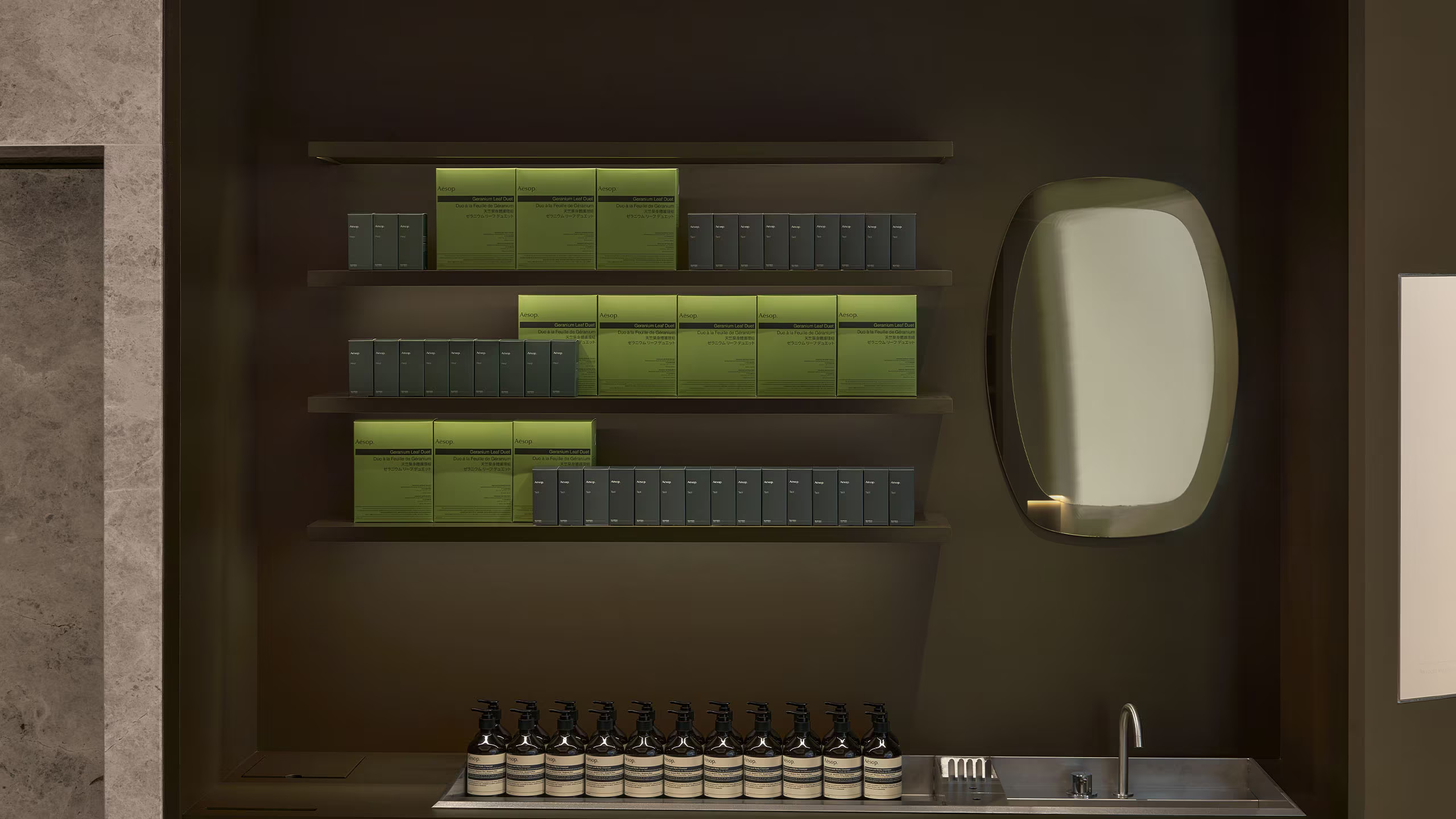 除此之外,空間設有隱閉的獨立水槽區域,顧客能在此與 Aesop 專業顧問展開更私密的諮詢對話。品牌團隊以一面精心挑選的復古鏡子,來展現店舖低調而精緻的設計美學。天花板上的威尼斯漆畫則呈現古典主義風格,與空間的間接照明相得益彰,營造出寧靜且溫暖的美好氛圍。