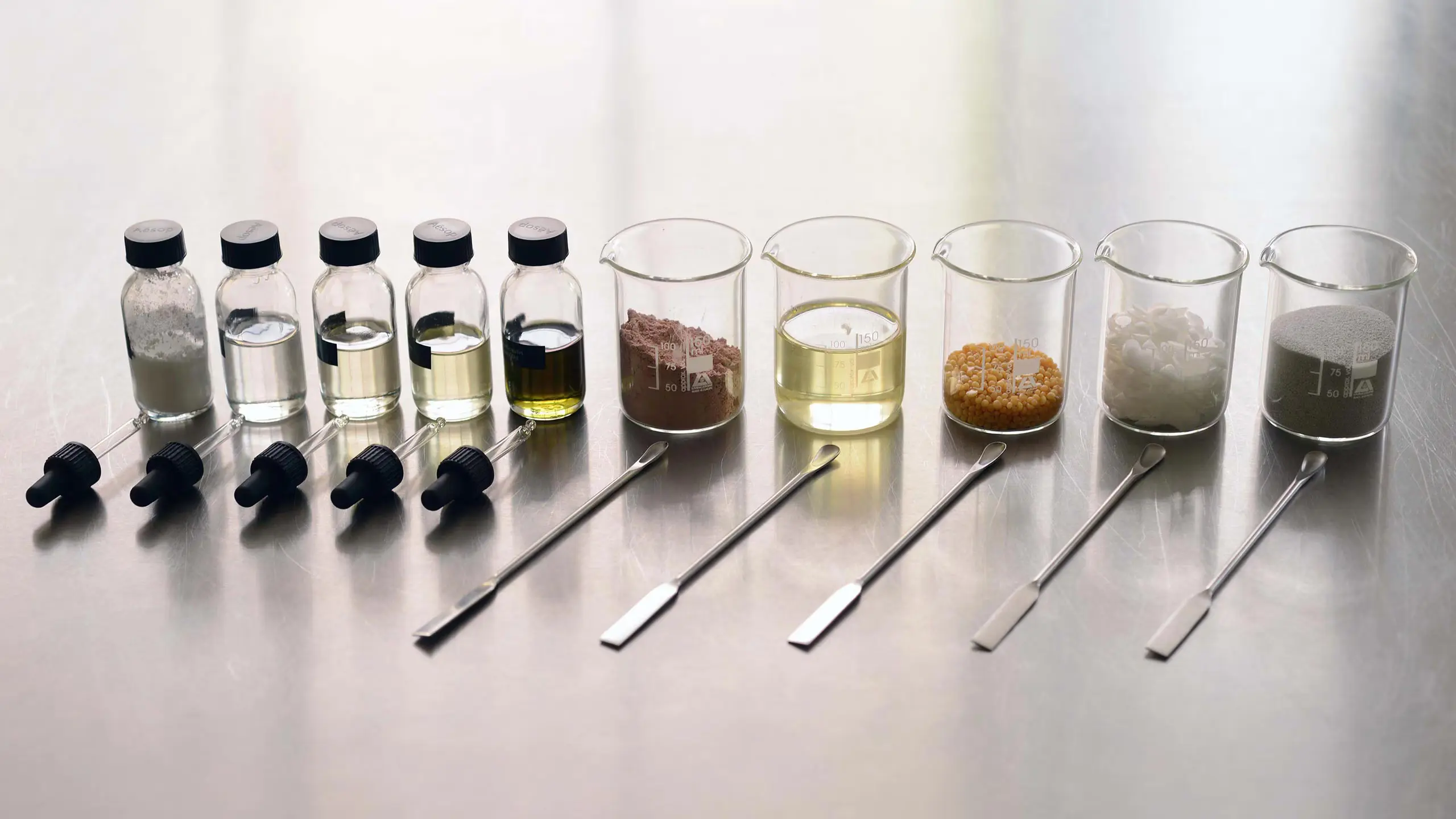 我們在公司內部的實驗室進行新產品開發活動,使用各種植物成分和實驗室研製成分創製配方,然後通過嚴格的測試進行完善和改進。關於什麼成分可以為Aesop所用,並沒有精確的衡量標準,而我們也不會對某些成分偏愛有加。但有些成分的名字經常出現在我們的產品標籤上,它們都是以功效和護膚護髮作用著稱的成分。